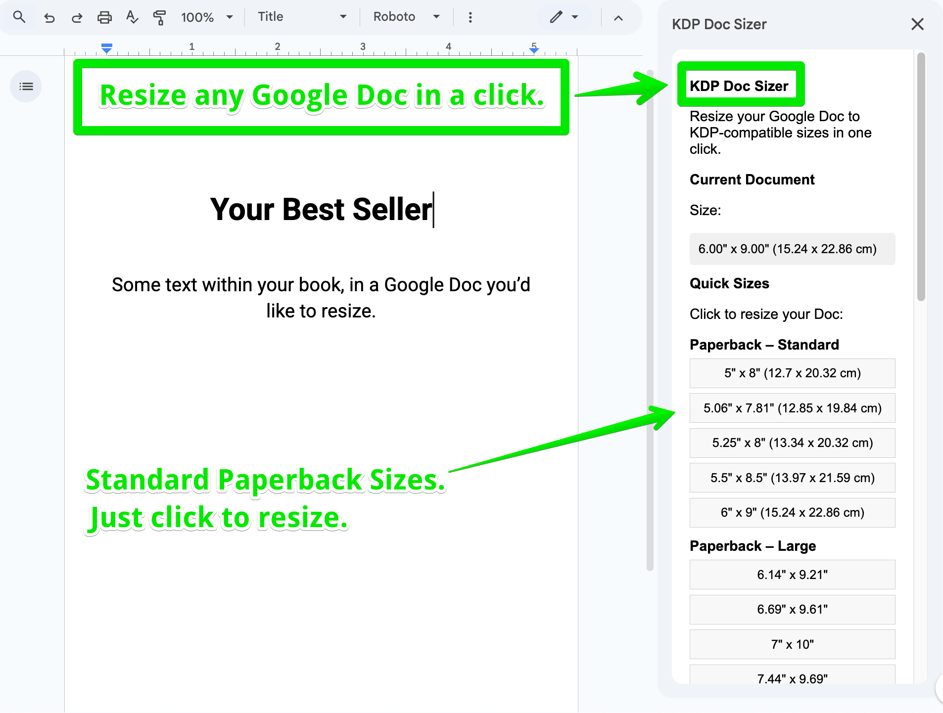 Still using Word or pasting into clunky templates? Now you can resize your Google Docs to KDP-standard sizes (paperback, hardcover, large print, and more) with one click.